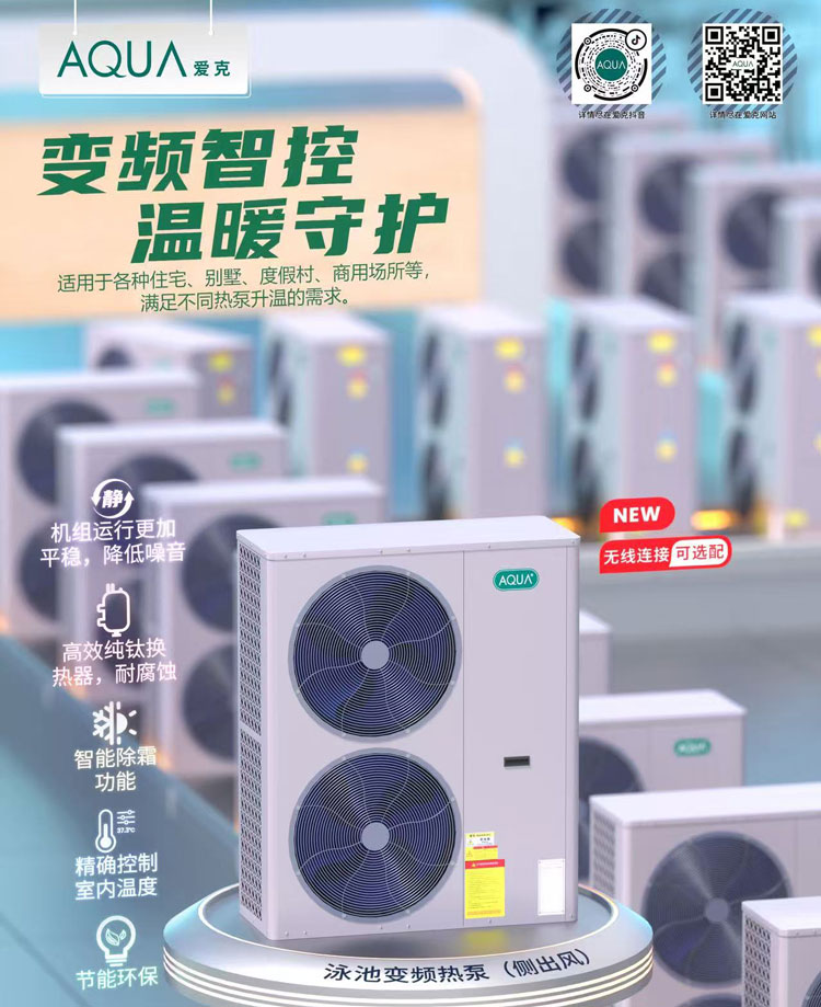在全球“雙碳”目標(biāo)深入推進(jìn)與綠色消費(fèi)理念日益普及的當(dāng)下,空氣源熱泵作為高效節(jié)能的清潔能源產(chǎn)品,正成為泳池恒溫領(lǐng)域的優(yōu)選方案。而深耕泳池設(shè)備領(lǐng)域近30年的知名品牌AQUA愛克,憑借豐富產(chǎn)品矩陣與強(qiáng)勁生產(chǎn)研發(fā)實(shí)力,持續(xù)為泳池恒溫市場(chǎng)注入活力。