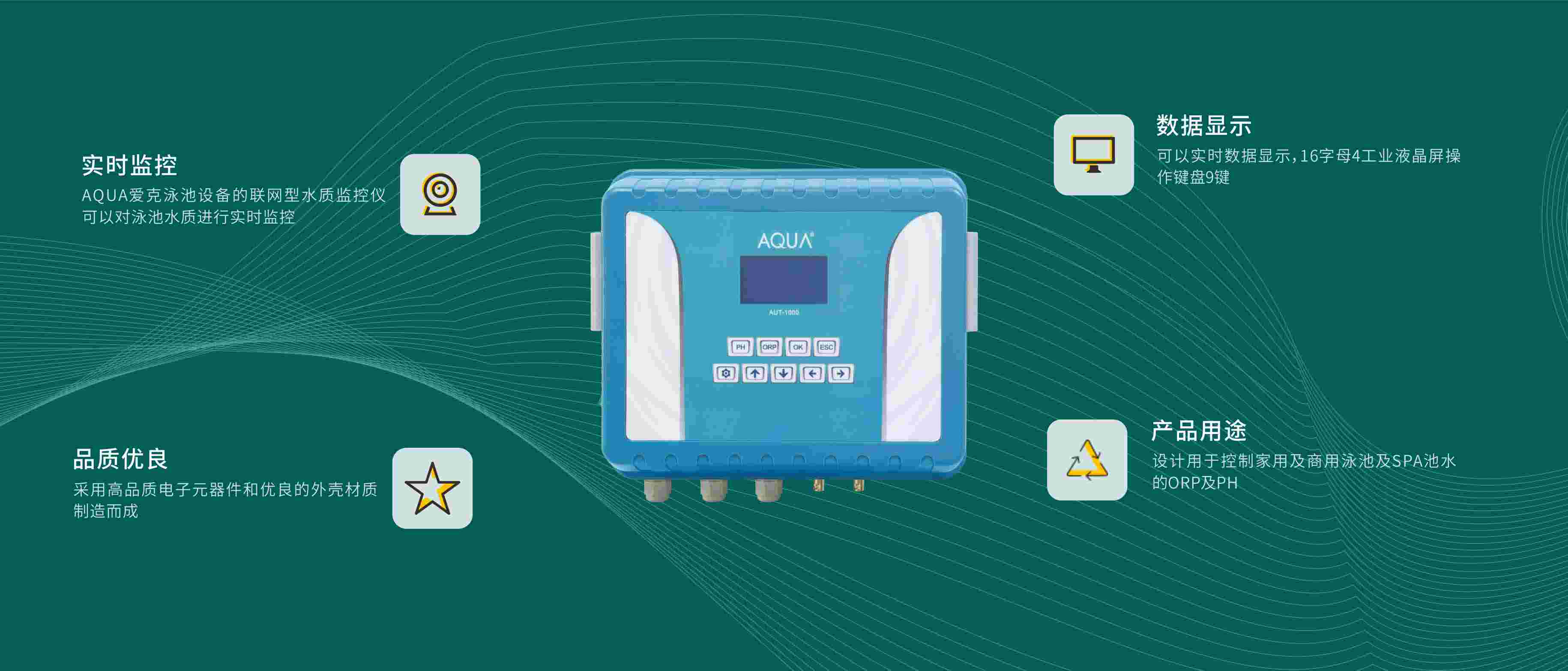 AQUA愛克泳池設備旗下的水質監控儀,采用高品質電子元器件和優良的外殼材料制造而成,是專注于水質監控的泳池智能監控系統,適用于私人泳池、商用泳池及SPA池水水質的控制及改善。