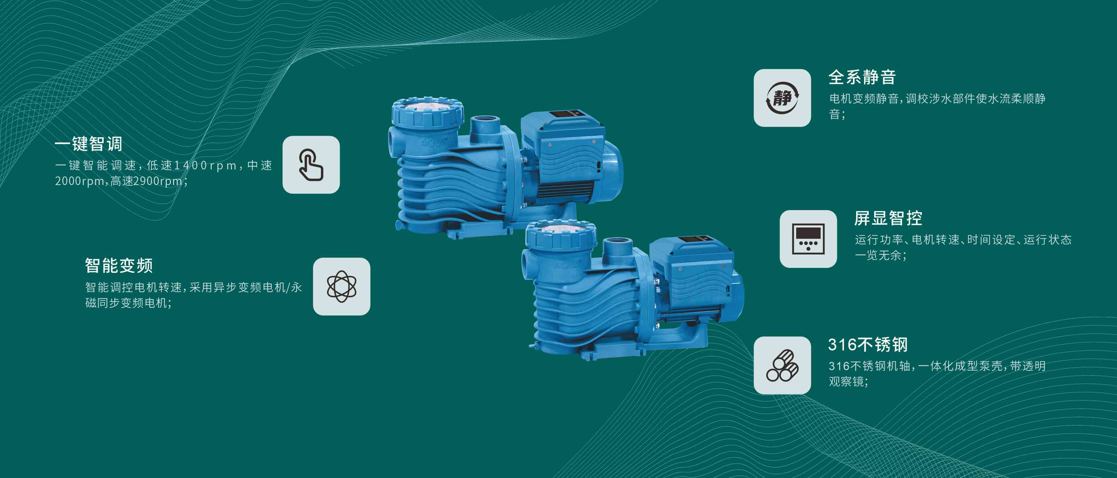 真變頻,大流量,AQUA愛克新款AVP、AVK系列變頻泳池溫泉水泵,同時可適用于60攝氏度溫泉水及鹽水池(鹽水濃度0.5%,低于海水),可承受壓力6kg/cm2。