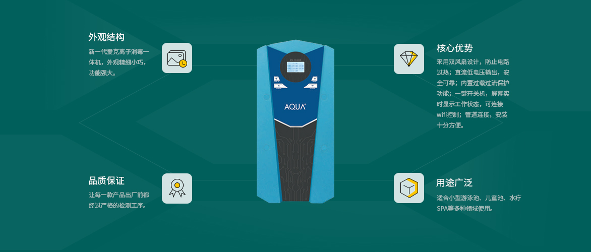 外觀時尚;立體式設計,占地面積小,節省空間,安裝簡易,AQUA愛克泳池消毒設備是游泳池、景觀池、海洋館、凈水處理、水產養殖、廢水處理、車間消毒等項目的理想選擇。